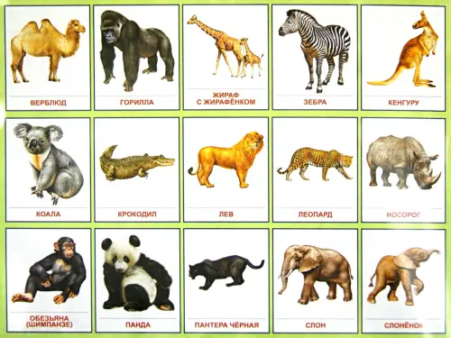 слон, жираф, крокодил, черепаха, жираф, газель, бегемот, зебра, леопард, обезьяна, носорог, верблюд, гепард, попугай, страус, кенгуру, панда, коала, .